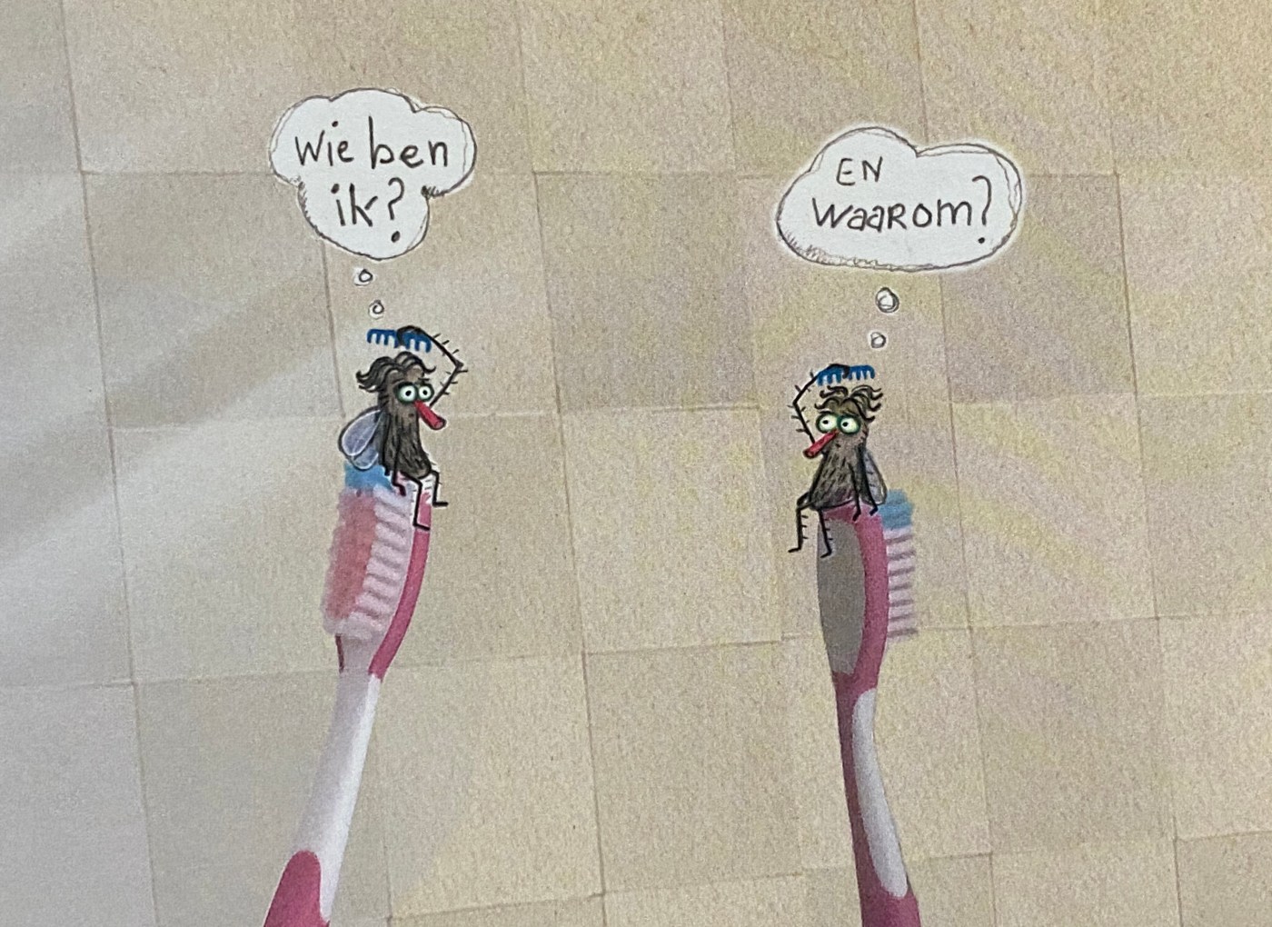 Ik heb nog nooit zo’n intiem portret van een vlieg onder ogen gekregen als dat van Evert-Jan. Het is een buitenbeentje, net als ik. Zijn naam alleen al maakt duidelijk dat hij anders is dan zijn broers Bob en Rob en zusje Pop. Hij is de enige vlieg van de familie die zijn handen wast. Hij trekt zich liefst van al terug op de badkamer waar alles netjes is. Zittend op zijn favoriete plek, een tandenborstel, kamt hij zijn haren in een perfecte middenstreep. Terwijl hij vol zorgen in de spiegel kijkt, passeren existentiële vragen de revue. Als toemaatje is hij de enige van de familie die niet houdt van poep met appelmoes. Niemand die het begrijpt. Ik wel.